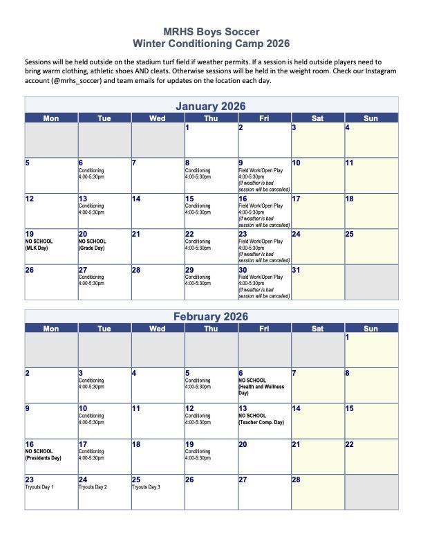 The MRHS boys soccer winter conditioning camp is now accepting registrations for any boys in grades 9-12 only, who are eligible to try out for the team in the spring. The camp costs $65 and will start on Jan. 6 and run through Feb. 19, 2026. The priority registration deadline for, which guarantees a player a shirt in their desired size, is Sunday, Dec. 7, 2025. Late registrations will be accepted but we cannot guarantee a shirt for late registrations. To view the dates and times for this camp look at the camp calendar document. Online registration for this camp can be found at https://jordansdut.