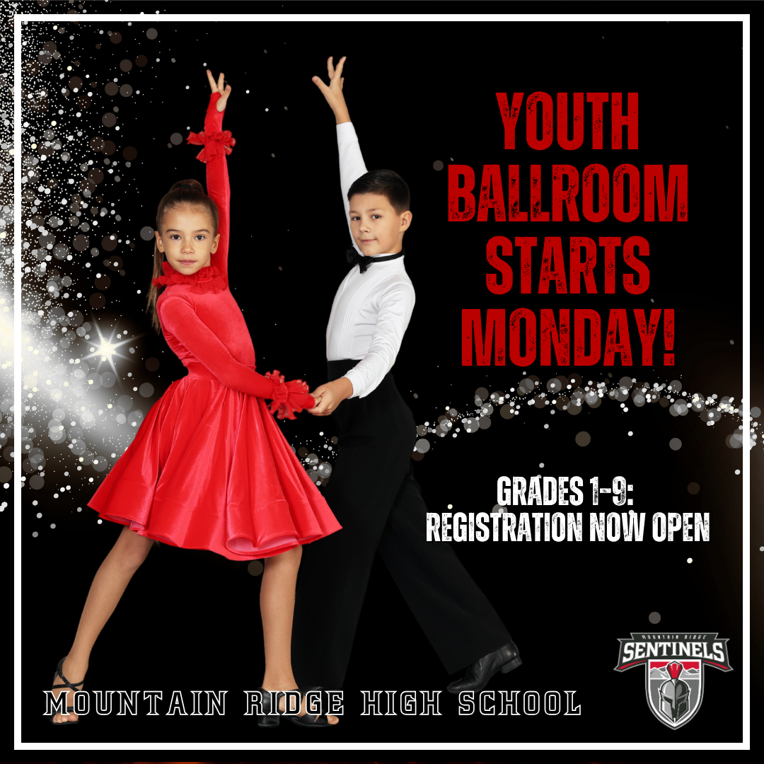 Calling all future ballroom stars! Mountain Ridge is excited to announce our Youth Ballroom Classes starting this Monday. Whether your student is a beginner or looking to sharpen their skills for next year's Junior Ballroom Formation Team tryouts, this camp is the perfect place to start.
